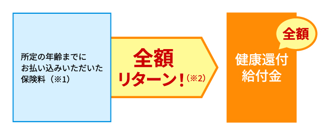 ※2 被保険者が健康還付給付金支払日に生存しているとき。健康還付給付金支払日とは、被保険者が健康還付給付金のお受取り対象年齢に到達する年単位の契約応当日をいいます。