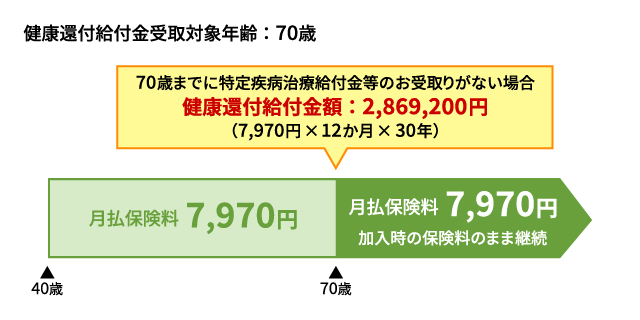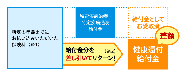 所定の年齢までにお払込みいただいた保険料※1は、「健康還付給付金」※2もしくは「特定疾病治療給付金等」※3としてお受け取りいただくことができます。お受け取りいただいた給付金等の合計値がお払い込みいただいた保険料を超えた場合、健康還付金のお受け取りはありません。